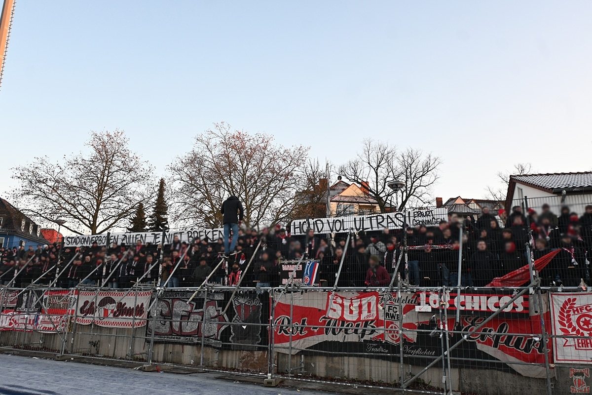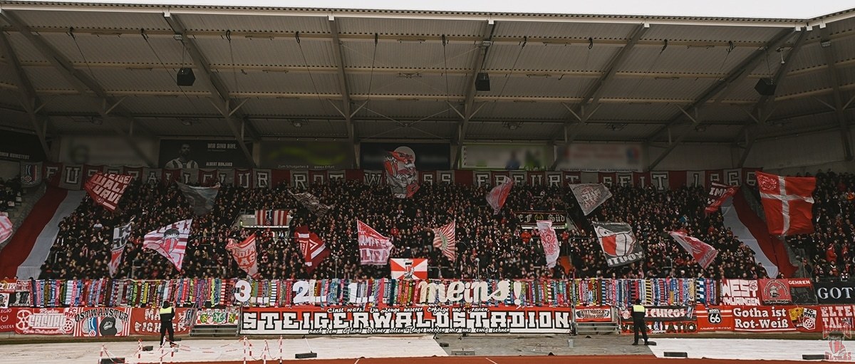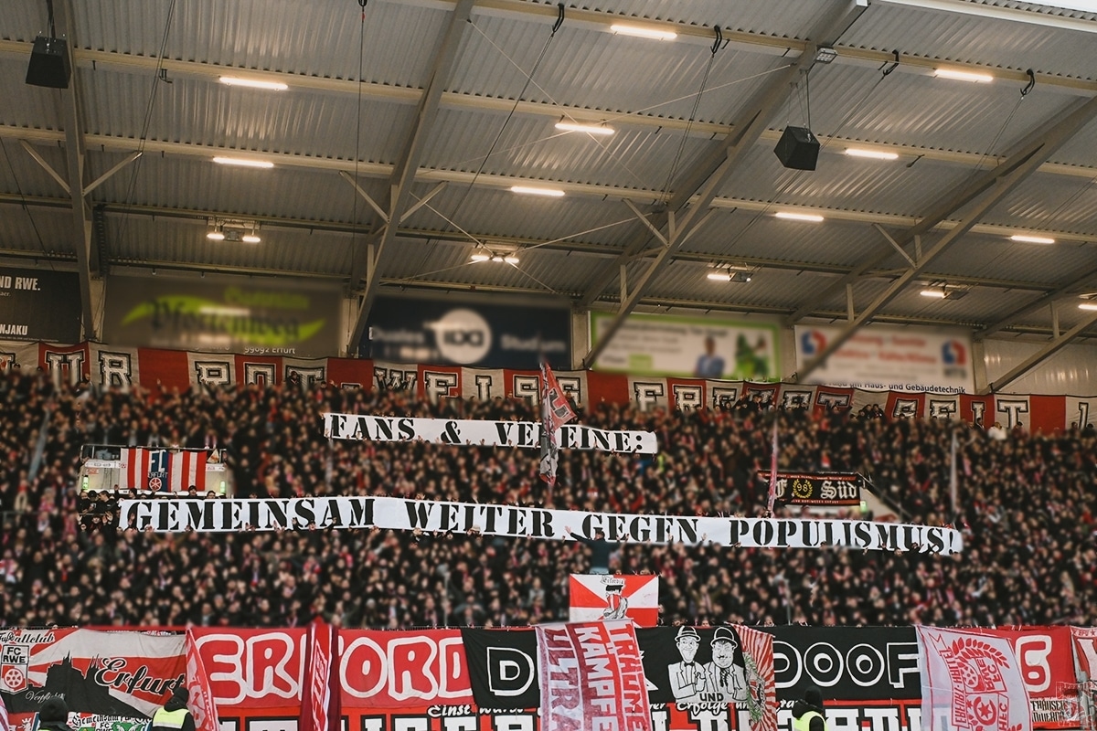 Herr Innenminister Maier, wir, die Verantwortlichen und aktiven Fanszenen des FC Rot-Weiß Erfurt und des FC Carl Zeiss Jena, appellieren an Sie: Setzen Sie sich bei der anstehenden IMK vom 3. bis 5. Dezember für den Erhalt der lebendigen Fankultur im Freistaat Thüringen ein und erteilen Sie den sicherheitspolitischen Überlegungen eine Absage.