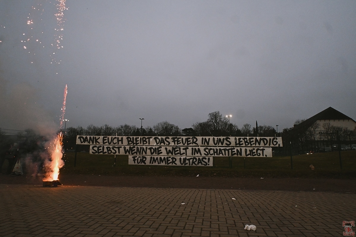 Letztes Wochenende noch mit wehenden Fahnen und Gesängen in der Leipziger Innenstadt, heute ohne Material und ohne Support in den Kurven. Wir werden die ersten 12 Spielminuten schweigend verbringen!